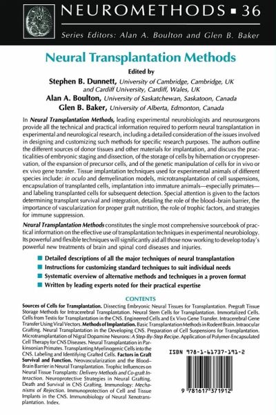 "...a book with so much information is very valuable for neuroscientists."- Clinical Neurology and Neurosurgery "Neural Transplantation Methods seeks to serve a particular need: to provide experimental neuroscientists with a source book of information to enable them to select and adapt transplantation techniques to their own experimental programs....Neural Transplantation Methods is a very interesting, up-to-date, and complete book on the technical and methodological issues in relation with experimental neural transplantation. It is a perfect source book of information for those who want to include the transplantation strategy in their experimental program." - Acta Neurologica Belgica