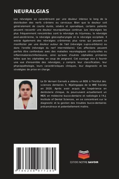 Les névralgies se caractérisent par une douleur intense le long de la distribution des nerfs crâniens ou cervicaux. Bien que la douleur soit généralement de courte durée, sévère et sporadique, certains patients peuvent ressentir une douleur neuropathique continue. Les névralgies les plus fréquemment rencontrées sont la névralgie du trijumeau, la névralgie post-zostérienne, la névralgie glossopharyngée et la névralgie occipitale. Il existe également des névralgies crâniennes plus rares qui peuvent se manifester par une douleur autour de l'oeil (névralgie supra-orbitaire) ou dans l'oreille (névralgie du nerf intermédiaire). Ces affections peuvent parfois être confondues avec des maladies neurologiques structurelles ou inflammatoires/infectieuses, ainsi qu'avec d'autres céphalées primaires telles que les céphalées en coup de poignard. Cet ouvrage vise à fournir une vue d'ensemble des névralgies, y compris leur classification, leur physiopathologie, leurs caractéristiques cliniques, leur diagnostic et les stratégies de prise en charge.
