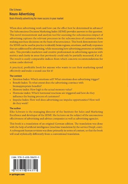 Marketing is one of the most important departments in a company. It is responsible for attracting new customers and retaining existing customers. Unfortunately, in many cases, high budgets are spent on marketing strategies that have little effect. This book on neuro-advertising will help you to effectively increase the impact of your advertising. It is based on the "Subconscious Decision Marketing Index" (SDMI). This neuroscientific method represents a new marketing tool that can be used to measure the subconscious impact of advertising. These include:
