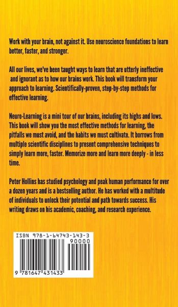 Work with your brain, not against it. Use neuroscience foundations to learn better, faster, and stronger. All our lives, we've been taught ways to learn that are utterly ineffective and ignorant as to how our brains work. This book will transform your approach to learning. Scientifically-proven, step-by-step methods for effective learning. Neuro-Learning is a mini tour of our brains, including its highs and lows. This book will show you the most effective methods for learning, the pitfalls we must avoid, and the habits we must cultivate. It borrows from multiple scientific disciplines to present comprehensive techniques to simply learn more, faster. Memorize more and learn more deeply - in less time. Peter Hollins has studied psychology and peak human performance for over a dozen years and is a bestselling author. He has worked with a multitude of individuals to unlock their potential and path towards success. His writing draws on his academic, coaching, and research experience. Achieve expertise faster, beat distractions and procrastination, and break down complexity. •A tour of the brain's main functions and how they affect your quest learning goals. •The learning techniques that work, and those that don't - with evidence. •How to never need to cram again. •The learning mistakes you are probably committing right now. •The learning myths you are probably still believing. •How your emotions and imagination can assist in learning. Learning to learn unlocks everything you want in life. It takes you from Point A t Point B, and is the only way to guarantee continual progress and development in your life and skills.