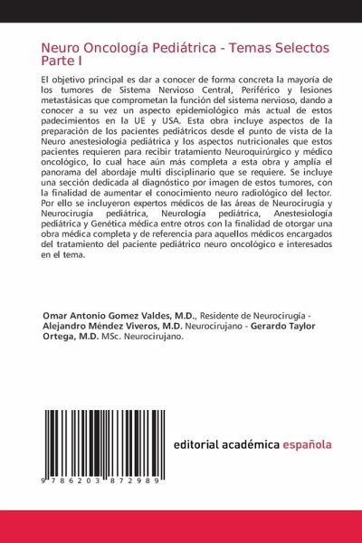 El objetivo principal es dar a conocer de forma concreta la mayoría de los tumores de Sistema Nervioso Central, Periférico y lesiones metastásicas que comprometan la función del sistema nervioso, dando a conocer a su vez un aspecto epidemiológico más actual de estos padecimientos en la UE y USA. Esta obra incluye aspectos de la preparación de los pacientes pediátricos desde el punto de vista de la Neuro anestesiología pediátrica y los aspectos nutricionales que estos pacientes requieren para recibir tratamiento Neuroquirúrgico y médico oncológico, lo cual hace aún más completa a esta obra y amplía el panorama del abordaje multi disciplinario que se requiere. Se incluye una sección dedicada al diagnóstico por imagen de estos tumores, con la finalidad de aumentar el conocimiento neuro radiológico del lector. Por ello se incluyeron expertos médicos de las áreas de Neurocirugía y Neurocirugía pediátrica, Neurología pediátrica, Anestesiología pediátrica y Genética médica entre otros con la finalidad de otorgar una obra médica completa y de referencia para aquellos médicos encargados del tratamiento del paciente pediátrico neuro oncológico e interesados en el tema.