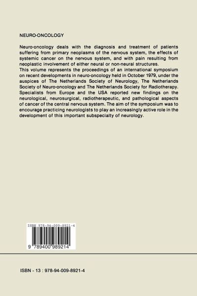 1. Neuro-Oncology: An Overview.- 2. Involvement of the Nervous System in Metastatic Disease of Childhood.- 3. Indications for Stereotactic Biopsy in Brain Tumours.- 4. Immune Deposits in Sural Nerve Biopsies from Patients with Paraneoplastic Polyneuropathy.- 5. The Pathology of Paraneoplastic Encephalomyelopathies.- 6. Treatment of Brain and Spinal Metastases.- 7. The Role of Radiotherapy in the Management of Intra-Cerebral Metastases.- 8. Radiotherapy in Epidural Spinal Cord Compression.- 9. Epidural Spinal Cord Compression from Metastatic Tumor: An Analysis of eighty-three Patients treated with Radiation Therapy and Steroids.- 10. Growth Retardation as a Complication of Radiotherapy in Children with Brain Tumours.- 11. Neurosurgical Management of Spinal Metastases Causing Cord and Cauda Equina Compression.- 12. Chemotherapy and the Nervous System.- 13. Superimposed Viral Infection. The Behaviour of Herpes Viruses in Immunosuppressed Patients.- 14. Central Nervous System Metastases in Small Cell Carcinoma of the Lung. A Review..- 15. CNS-Leukaemia Prophylaxis in Adult Acute Lymphoblastic Leukaemia.- 16. Abnormal CT-scans of the Brain in Children with ALL: The Role of Intravenous MTX Therapy.- 17. Pathology of Central-Nervous-System Diseases in Childhood Leukemia.- 18. Cerebro-Meningeal Complications in Non-Hodgkin-Lymphoma and Adult Myeloid Leukemia.- 19. Subdural Haematoma due to Meningeal Metastasis.- 20. Clinical Aspects of Meningeal Carcinomatosis.- 21. Treatment of Meningeal Leucaemia, Meningeal Lymphoma and Carcinomatosis.- Short Communications.- 22. The Role which Viruses may play in the Causation of Paraneoplastic Neurological Syndromes.- 23. CSF Cytology in Secondary CNS Malignancies.