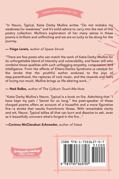 Neuro, Typical is a story in poems of author Katie Mullins's recovery from a brain-stem stroke told in disorganized clips and stories: the focus shifts from the physical to the mental and spiritual, from fixed "timeline" events like a housefire to trying to define a relationship there doesn't seem to be a word for.