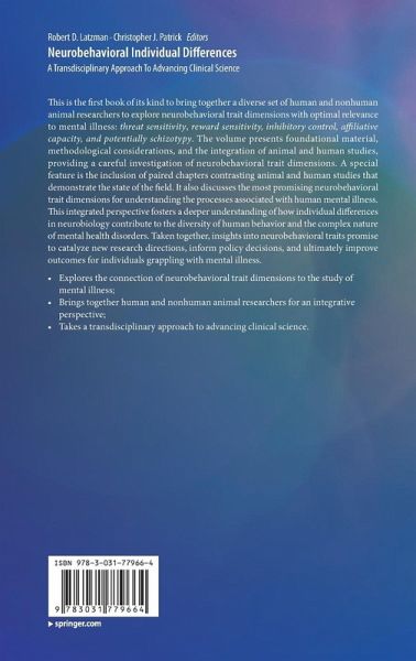This is the first book of its kind to bring together a diverse set of human and nonhuman animal researchers to explore neurobehavioral trait dimensions with optimal relevance to mental illness: threat sensitivity, reward sensitivity, inhibitory control, affiliative capacity, and schizotypy. The volume presents foundational material, methodological considerations, and the integration of animal and human studies, providing a careful investigation of neurobehavioral trait dimensions. A special feature is the inclusion of paired chapters contrasting animal and human studies that demonstrate the state of the field. It also discusses the most promising neurobehavioral trait dimensions for understanding the processes associated with human mental illness. This integrated perspective fosters a deeper understanding of how individual differences in neurobiology contribute to the diversity of human behavior and the complex nature of mental health disorders. Taken together, insights into neurobehavioral traits promise to catalyze new research directions, inform policy decisions, and ultimately improve outcomes for individuals grappling with mental illness.