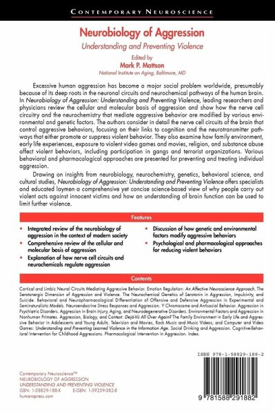 Aggression is a highly conserved behavioral adaptation that evolved to help org- isms compete for limited resources and thereby ensure their survival. However, in modern societies where resources such as food, shelter, etc. are not limiting, aggr- sion has become a major cultural problem worldwide presumably because of its deep seeded roots in the neuronal circuits and neurochemical pathways of the human brain. In Neurobiology of Aggression: Understanding and Preventing Violence, leading experts in the fields of the neurobiology, neurochemistry, genetics, and behavioral and cultural aspects of aggression and violence provide a comprehensive collection of review articles on one of the most important cross-disciplinary issues of our time. Rather than summarize the topics covered by each author in each chapter, I present a schematic diagram to guide the reader in thinking about different aspects of aggr- sive and violent behavior from its neurobiological roots to environmental factors that can either promote or prevent aggression to visions of some of the most horrific acts of violence of our times, and then towards the development of strategies to reduce aggressive behavior and prevent violence. It is hoped that Neurobiology of Aggression: Understanding and Preventing V- lence will foster further research aimed at understanding the environmental genetic and neurochemical roots of aggression and how such information can be used to move forward towards the goal of eliminating violence.