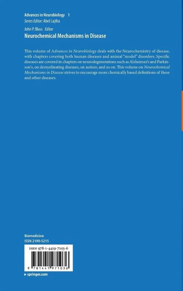 Mechanisms versus Diagnoses.- Molecular Mechanisms of Neuronal Death.- Animal Models of Neurodegenerative Diseases.- Vitamins and Vitamin Deficiencies.- Brain Edema in Neurological Disease.- Pathology of Monoamine Transporters.- Glutamate and Glutamine in Brain Disorders.- The X-linked Mental Retardation.- Cognitive Deficits in Neurodegenerative Disorders.- NFkappaB in Brain Diseases.- Trinucleotide-Expansion Diseases.- Neuroinflammation.- Neurochemistry of Autism.- RNA Pathologies in Neurological Disorders.- Pain.- Biology of Demyelinating Diseases.- Brain Protein Oxidation and Modification for Good or Bad in Alzheimer's Disease.- Oxidative Stress and Alzheimer Disease: Mechanisms and Therapeutic Opportunities.- Tau and Tauopathies.- Zinc, Zinc Transport and Sequestration Proteins in the Brain in the Progression of Alzheimer's Disease.- The Genetics of Alzheimer's Disease and Parkinson's Disease.- Nicotine Receptors in Brain Diseases.- Lysosomal Storage Disorders.- Genetic signaling in glioblastoma multiforme: a current overview.