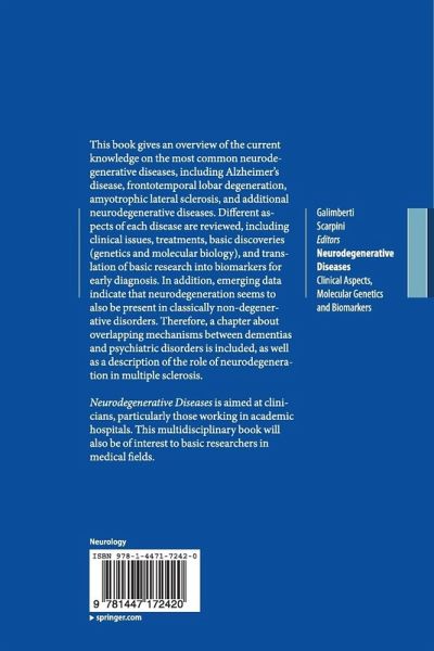 This book gives an overview of the current knowledge on the most common neurodegenerative diseases, including Alzheimer's disease, frontotemporal lobar degeneration, amyotrophic lateral sclerosis, and additional neurodegenerative diseases. Different aspects of each disease are reviewed, including clinical issues, treatments, basic discoveries (genetics and molecular biology), and translation of basic research into biomarkers for early diagnosis. In addition, emerging data indicate that neurodegeneration seems to also be present in classically non-degenerative disorders. Therefore, a chapter about overlapping mechanisms between dementias and psychiatric disorders is included, as well as a description of the role of neurodegeneration in multiple sclerosis.