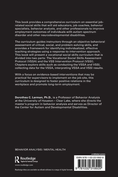 This book provides a comprehensive curriculum on essential job-related social skills that will aid educators, job coaches, behavior specialists, behavior analysts, and other professionals to improve employment outcomes of individuals with autism spectrum disorder and other neurodevelopmental disabilities.