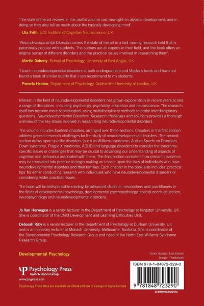 Interest in the field of neurodevelopmental disorders has grown exponentially in recent years across a range of disciplines, including psychology, psychiatry, education and neuroscience. The research itself has become more sophisticated, using multidisciplinary methods to probe interdisciplinary questions. Neurodevelopmental Disorders: Research Challenges and Solutions provides a thorough overview of the key issues involved in researching neurodevelopmental disorders. The volume includes 14 chapters, arranged over three sections. Chapters in the first section address general research challenges for the study of neurodevelopmental disorders. The second section draws upon specific disorders (such as Williams syndrome, Autism Spectrum Disorders, Down Syndrome, Fragile X Syndrome, ADHD, and Language Disorders) to consider the syndrome-specific issues or challenges that may be crucial to advancing our understanding of aspects of cognition and behavior associated with them. The final section considers how research evidence may be translated into practice to begin making an impact upon the lives of individuals who have neurodevelopmental disorders and their families. Each chapter in the book also includes 'practical tips' for either conducting research with individuals who have neurodevelopmental disorders or considering wider practical issues. The book will be indispensable reading for advanced students, researchers, and practitioners in the fields of developmental psychology, developmental psychopathology, special needs education, neuropsychology, and neurodevelopmental disorders.