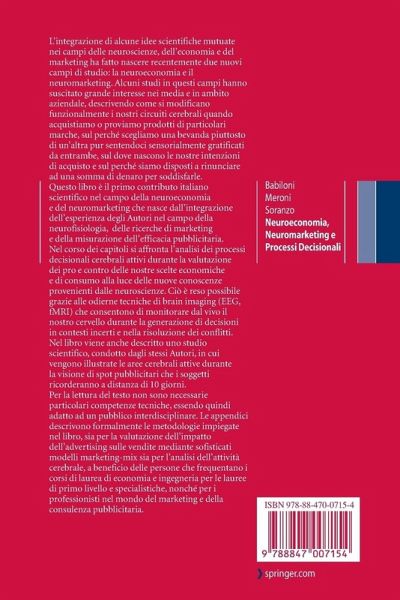 L'obbiettivo di questo libro è quello di presentare in maniera razionale un nuovo insieme di conoscenze circa il funzionamento cerebrale in merito alle scelte di tipo economico. In particolare si vuole fare colmare una lacuna nella editoria italiana relativa a questi temi, che spesso vengono comunicati in maniera imprecisa e scandalistica dai giornali e dai mass media. Il libro fornisce alcuni strumenti scientifici per affrontare il problema di come il nostro cervello genera delle scelte in campo economico, in un linguaggio piano e non specialistico. Vengono descritti i risultati del primo studio italiano relativo all'osservazione di filmati commerciali televisivi, analizzati mediante l'elettroencefalografia ad alta risoluzione spaziale. La neuroeconomia è una nuova scienza che si sta sviluppando rapidamente nei paesi anglosassoni. Questo libro spiega i concetti di neuroeconomia e neuromarketing anche al pubblico italiano.