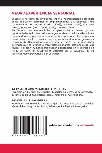 El Libro tiene como objetivo comprender la neuroexperiencia sensorial como innovación gerencial en emprendimientos gastronómicos. Fue sustentada en los autores Braidot (2009), Schmitt (2006), Manzano (2012), Stevenson (2001), Daft (2005), Drucker (1997). En Síntesis, los emprendimientos gastronómicos tienen grandes oportunidades en los mercados emergentes, dentro de los cuales existen consumidores dispuestos a dejarse seducir por todas las propuestas comerciales que los lleven a recorrer espacios donde se genere un Universo de Neuroexperiencia sensorial a través de la innovación gerencial que se alcanza a manifestar en marcas gastronómicas más vívidas, cálidas y humanas que buscan posicionarse en el mercado en miras de tener un crecimiento orgánico en la búsqueda de su sostenibilidad y permanencia en el tiempo.