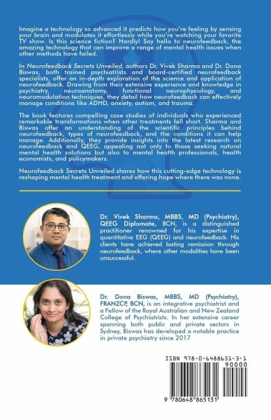 Imagine a technology so advanced it predicts how you're feeling by sensing your brain and modulates it effortlessly while you're watching your favorite TV show. Is this science fiction? Hardly! Say hello to neurofeedback, the amazing technology that can improve a range of mental health issues when other methods have failed. In Neurofeedback Secrets Unveiled, authors Dr. Vivek Sharma and Dr. Dona Biswas, both trained psychiatrists and board-certified neurofeedback specialists, offer an in-depth exploration of the science and application of neurofeedback. Drawing from their extensive experience and knowledge in psychiatry, neuroanatomy, functional neurophysiology, and neuromodulation techniques, they detail how neurofeedback can effectively manage conditions like ADHD, anxiety, autism, and trauma. The book features compelling case studies of individuals who experienced remarkable transformations when other treatments fell short. Sharma and Biswas offer an understanding of the scientific principles behind neurofeedback, types of neurofeedback, and the conditions it can help manage. Additionally, they provide insights into the latest research on neurofeedback and QEEG, appealing not only to those seeking natural mental health solutions but also to mental health professionals, health economists, and policymakers. Neurofeedback Secrets Unveiled shares how this cutting-edge technology is reshaping mental health treatment and offering hope where there was none. AUTHOR Dr. Vivek Sharma, MBBS, MD (Psychiatry), QEEG Diplomate, BCN, is a distinguished practitioner renowned for his expertise in quantitative EEG (QEEG) and neurofeedback. His clients have achieved lasting remission through neurofeedback, where other modalities have been unsuccessful. Dr. Dona Biswas, MBBS, MD (Psychiatry), FRANZCP, BCN, is an integrative psychiatrist and a Fellow of the Royal Australian and New Zealand College of Psychiatrists. In her extensive career spanning both public and private sectors in Sydney, Dr. Biswas has developed a notable practice in private psychiatry since 2017.