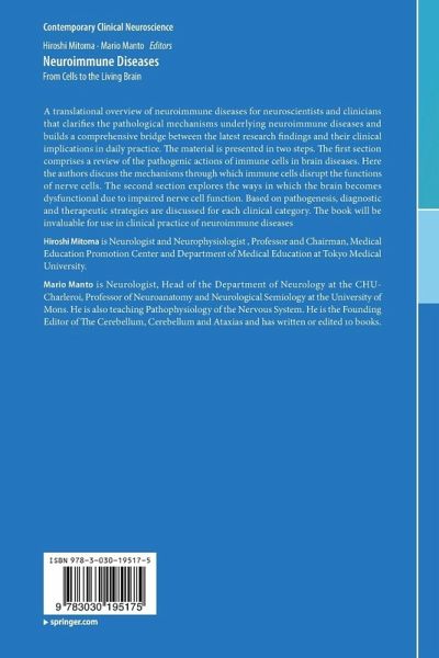 1. Overview of mechanisms underlying neuroimmune diseases.- 2. Roles of interleukines in neurological autoimmunity.- 3. Roles of regulatory T cells in neurological autoimmunity.- 4.Immune tolerance triggering neurological autoimmunity.- 5. Disruption of blood-brain barrier and blood-nerve barrier: a key step in development of immune-mediated neurological diseases.- 6. Pathological mechanisms underlying production of autoantibodies.- 7. Significance of autoantibodies: cause or result?.- 8. Multiple actions of microglia.- 9. Autoimmune astropathy.- 10. Genetic factors indicating susceptibility to neurological diseases.- 11. General principles of immunotherapy.- 12. Multiple sclerosis.- 13. Neuromyelitis optica: Diagnosis and therapies.- 14. Atypical inflammatory demyelinating syndrome.- 15. Central nervous system vasculitis.- 16. Neuro-Beçhet and Sjögren disease.- 17. Immune-mediated cortical encephalopathy (Limbic encephalitis).- 18. Immune-mediated cerebellar ataxias.- 19. Stiff-Person syndrome.- 20. Guillain-Barré syndrome.- 21. Chronic inflammatory demyelinating polyneuropathy: Diagnosis and therapy.- 22. Immune-mediated disorders of neuro-muscular junctions.- 23. Myositis.- 24. Infection-related immune diseases.- 25. Paraneoplastic neurological syndromes; Diagnosis and Therapies.
