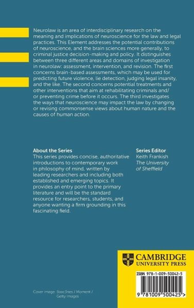 "Neurolaw is an area of interdisciplinary research on the meaning and implications of neuroscience for the law and legal practices. This Element addresses the potential contributions of neuroscience, and the brain sciences more generally, to criminal justice decision-making and policy. It distinguishes between three different areas and domains of investigation in neurolaw: assessment, intervention, and revision. The first concerns brain-based assessments, which may be used for predicting future violence, lie detection, judging legal insanity, and the like. The second concerns potential treatments and other interventions that aim at rehabilitating criminals and/or preventing crime before it occurs. The third investigates the ways that neuroscience may impact the law by changing or revising commonsense views about human nature and the causes of human action"--