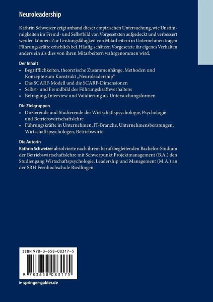 Begrifflichkeiten, theoretische Zusammenhänge, Methoden und Konzepte zum Konstrukt "Neuroleadership".- Das SCARF-Modell und die SCARF-Dimensionen.- Selbst- und Fremdbild des Führungskräfteverhaltens.- Befragung, Interview und Validierung als Untersuchungsformen.