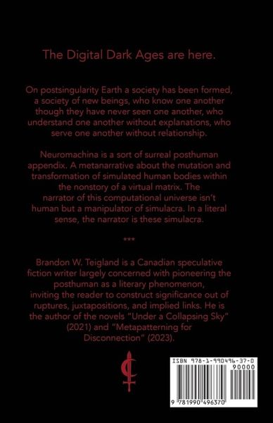 The Digital Dark Ages are here. On postsingularity Earth a society has been formed, a society of new beings, who know one another though they have never seen one another, who understand one another without explanations, who serve one another without relationship. Neuromachina is a sort of surreal posthuman appendix. A metanarrative about the mutation and transformation of simulated human bodies within the nonstory of a virtual matrix. The narrator of this computational universe isn't human but a manipulator of simulacra. In a literal sense, the narrator is these simulacra. Brandon W. Teigland is a Canadian speculative fiction writer largely concerned with pioneering the posthuman as a literary phenomenon, inviting the reader to construct significance out of ruptures, juxtapositions, and implied links. He is the author of the novels Under a Collapsing Sky (2021) and Metapatterning for Disconnection (2023).
