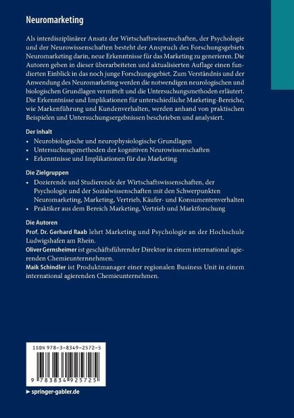 Als interdisziplinärer Ansatz der Wirtschaftswissenschaften, der Psychologie und der Neurowissenschaften besteht der Anspruch des Forschungsgebiets Neuromarketing darin, neue Erkenntnisse für das Marketing zu generieren. Die Autoren geben in dieser überarbeiteten und aktualisierten Auflage einen fundierten Einblick in das noch junge Forschungsgebiet. Zum Verständnis und der Anwendung des Neuromarketing werden die notwendigen neurologischen und biologischen Grundlagen vermittelt und die Untersuchungsmethoden erläutert. Die Erkenntnisse und Implikationen für unterschiedliche Marketing-Bereiche, wie Markenführung und Kundenverhalten, werden anhand von praktischen Beispielen und Untersuchungsergebnissen beschrieben und analysiert.