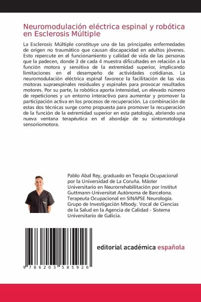 La Esclerosis Múltiple constituye una de las principales enfermedades de origen no traumático que causan discapacidad en adultos jóvenes. Esto repercute en el funcionamiento y calidad de vida de las personas que la padecen, donde 3 de cada 4 muestra dificultades en relación a la función motora y sensitiva de la extremidad superior, implicando limitaciones en el desempeño de actividades cotidianas. La neuromodulación eléctrica espinal favorece la facilitación de las vías motoras supraespinales residuales y espinales para provocar resultados motores. Por su parte, la robótica aporta intensidad, un elevado número de repeticiones y un entorno interactivo para aumentar y promover la participación activa en los procesos de recuperación. La combinación de estas dos técnicas surge como propuesta para promover la recuperación de la función de la extremidad superior en esta patología, abriendo una nueva ventana terapéutica en el abordaje de su sintomatología sensoriomotora.