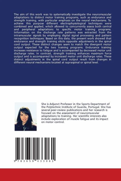 The aim of this work was to systematically investigate the neuromuscular adaptations to distinct motor training programs, such as endurance and strength training, with particular emphasis on the neural mechanisms. To achieve this purpose different electrophysiological techniques were combined and applied, which allowed to concurrently assess both central and peripheral adaptations to specific motor training programs. Information on the discharge rate patterns was extracted from the intramuscular signals by employing digital signal processing and pattern recognition techniques. Based on this data, the present work showed that endurance and strength training elicits opposite adjustments in the spinal cord output. These distinct changes seem to match the divergent motor output expected for the two training programs. Endurance training increases resistance to fatigue and is accompanied by decreased motor unit discharge rates. In contrast, strength training enhances maximum force output and is accompanied by increased motor unit discharge rates. These distinct adjustments in the spinal cord output result from changes in different neural mechanisms located at supraspinal or spinal level.
