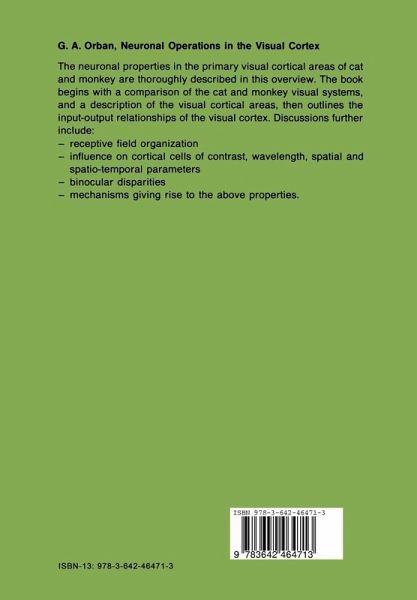1 The Visual System of Cat and Monkey Compared.- 1.1 The Basic Layout of the Visual System in Cat, Owl Monkey, and Rhesus Monkey.- 1.1.1 The Retina.- 1.1.2 The Optic Chiasm and Optic Tract.- 1.1.3 The Dorsal Lateral Geniculate Nucleus (dLGN).- 1.1.4 Visual Cortex.- 1.1.5 Pulvinar.- 1.1.6 Callosal Connections.- 1.2 Quantitative Aspects of the Retino-Geniculo-Cortical Projections.- 1.2.1 The Overall Numbers of Cells in the Visual Pathway.- 1.2.2 Distribution of Retinal Cell Populations.- 1.2.3 Magnification Factors.- 1.3 Conclusion.- 2 The Visual Cortical Areas of the Cat.- 2.1 Description of the Visual Cortical Areas.- 2.1.1 Area 17: The Prototype of Visual Cortical Areas.- 2.1.2 Areas 18 and 19.- 2.1.3 The Lateral Suprasylvian Areas.- 2.1.4 Areas 20 and 21.- 2.1.5 Additional Visual Areas?.- 2.2 The Levels of Processing in the Visual Cortical System of the Cat.- 2.3 Additional Observations on the Retinotopic Organization in the Primary Complex.- 2.3.1 Variability of the 3 Cortical Maps.- 2.3.2 RF Scatter.- 2.3.3 The 17-18 Border and the Question of the Naso-Temporal Overlap.- 2.3.4 The 18-19 Border and the Question of the Visual Field Islands.- 2.4 Conclusion.- 3 Afferent Projections to Areas 17, 18, 19 of the Cat: Evidence for Parallel Input.- 3.1 The Relay of Retinal Afferents: The Dorsal Lateral Geniculate Nuclear Complex.- 3.2 The Geniculocortical Projection.- 3.3 Functional Streams in the Retino-Geniculocortical Projection.- 3.3.1 Functional Properties of Retinal and Geniculate X, Y, W Cells.- 3.3.2 Correlation with Retinal Morphology.- 3.3.3 Separation of Functional Streams at LGN Level.- 3.3.4 Correlation with LGN Morphological Types.- 3.3.5 Distribution of Functional Streams in dLGN Nuclear Complex.- 3.3.6 Input to Different Areas of Primary Visual Complex.-3.4 Physiological Identification of the Functional Type of Afferents to Areas 17, 18 and 19.- 3.5 The Termination of Geniculate Afferents in the Visual Cortex.- 3.6 Other Subcortical Afferents: Pulvinar-Lateralis Posterior Complex, Intralaminar Nuclei, Claustrum, and Brainstem.- 3.7 The Ipsilateral Corticocortical Connections.- 3.8 The Connections Through the Corpus Callosum.- 3.9 Conclusion.- 4 Receptive Field Organization in Areas 17, 18 and 19 of the Cat.- 4.1 Twenty Years with the Simple-Complex-Hypercomplex Scheme.- 4.2 Criteria for Classifying Cortical RFs.- 4.2.1 The ON-OFF Overlap or the Parcellation of the RF into Subregions.- 4.2.2 Position Test.- 4.2.3 RF Dimensions.- 4.2.4 End-Stopping or the Hypercomplex Property.- 4.3 The A, B, C, S Scheme.- 4.3.1 Properties and Distribution of Cell Types.- 4.3.2 The S and A Families.- 4.3.3 Responses to Other Stimuli.- 4.4 Correspondence of the A, B, C, S Scheme with Other Classification Schemes.- 4.5 Conclusion.- 5 Parameter Specificity of Visual Cortical Cells and Coding of Visual Parameters.- 5.1 The Tuned Cells as Bandpass Filters: The Multichannel Representation of a Parameter.- 5.2 Are All Tuned Cells Simple (Passive) Bandpass Filters or Are Some of Them Active Filters?.- 5.3 Cells with Thresholds as High-Pass Filters: Single or Multichannel Representation of a Parameter.- 5.4 Conclusion.- 6 Influence of Luminance and Contrast on Cat Visual Cortical Neurons.- 6.1 Contrast-Response Curves Obtained with Sinusoidal Gratings.- 6.2 Contrast-Response Curves Obtained with Slits.- 6.3 The Extreme Contrast Sensitivity at the 18-19 Border.- 6.4 Influence of Contrast and Luminance on Other Response Properties.- 6.5 Conclusion.- 7 Coding of Spatial Parameters by Cat Visual Cortical Neurons: Influence of StimulusOrientation, Length, Width, and Spatial Frequency.- 7.1 Orientation Tuning of Cortical Cells.- 7.1.1 Definitions and Criteria.- 7.1.2 Quantitative Determinations: Orientation-Response Curves.- 7.1.3 Qualitative Determination: Hand-Plotting.- 7.1.4 Distribution of Preferred Orientations.- 7.1.5 Orientation Columns.- 7.1.6 Conclusion.- 7.2 Influence of Stimulus Length on Cortical Cells.- 7.3 Selectivity of Cortical Neurons for Spatial Frequency and Stimulus Width.- 7.3.1 Selectivity for Spatial Frequency.- 7.3.2 Spatial Frequency and Coding of Stimulus Dimensions.- 7.3.3 Linearity of Cortical Cells.- 7.3.4 The Visual Cortex as a Fourier Analyzer.- 7.3.5 Spatial Frequency: Conclusion.- 7.4 Spatial Parameters: Conclusion.- 8 Coding of Spatio-Temporal Parameters by Cat Visual Cortical Neurons: Influence of Stimulus Velocity Direction and Amplitude of Movement.- 8.1 Influence of Stimulus Velocity.- 8.2 Influence of the Direction of Movement.- 8.3 Influence of Stimulus Movement Amplitude.- 8.4 Conclusion.- 9 Binocular Interactions in Cat Visual Cortical Cells and Coding of Parameters Involved in Static and Dynamic Depth Perception.- 9.1 The Binocularity of Cortical Cells and the Ocular Dominance Scheme.- 9.2 Position Disparity Tuning Curves and the Coding of Static Depth.- 9.3 Orientation Disparity, Another Mechanism for Static Depth Discrimination?.- 9.4 Neuronal Mechanisms Underlying Dynamic Depth Perception (Motion in Depth).- 9.5 Conclusion.- 10 The Output of the Cat Visual Cortex.- 10.1 The Projections of Layer V to the Superior Colliculus, Pons, Pretectum, and Pulvinar-LP Complex.- 10.2 The Projections of Layer VI to the dLGN and the Claustrum.- 10.3 The Commissural Projections.- 10.4 The Associative Corticocortical Projections.- 10.5 Conclusion.- 11 Correlation BetweenGeniculate Afferents and Visual Cortical Response Properties in the Cat.- 11.1 Electrical Stimulation of the Visual Pathways.- 11.2 The Question of ON or OFF Cell Input to Cortical S Cells.- 11.3 Other Attempts to Identify the LGN Input to Cortical Cells.- 11.4 Conclusion.- 12 Intracortical Mechanisms Underlying Properties of Cat Visual Cortical Cells.- 12.1 The Role of Intracortical Inhibition.- 12.1.1 Orientation Selectivity.- 12.1.2 Direction Selectivity.- 12.1.3 End-Stopping.- 12.1.4 Ocular Dominance.- 12.1.5 Velocity Upper Cut-Off.- 12.1.6 Absence of Response to Two-Dimensional Noise.- 12.2 Properties of the I