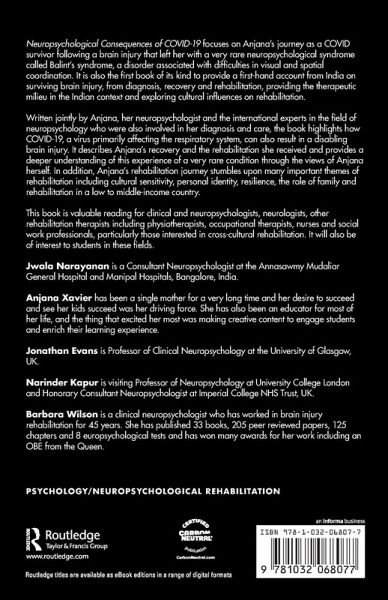 Neuropsychological Consequences of COVID-19 focuses on Anjana's journey as a COVID survivor following a brain injury that left her with a very rare neuropsychological syndrome called Balint's syndrome, a disorder associated with difficulties in visual and spatial coordination. It is also the first book of its kind to provide a first-hand account from India on surviving brain injury, from diagnosis, recovery and rehabilitation, providing the therapeutic milieu in the Indian context and exploring cultural influences on rehabilitation.