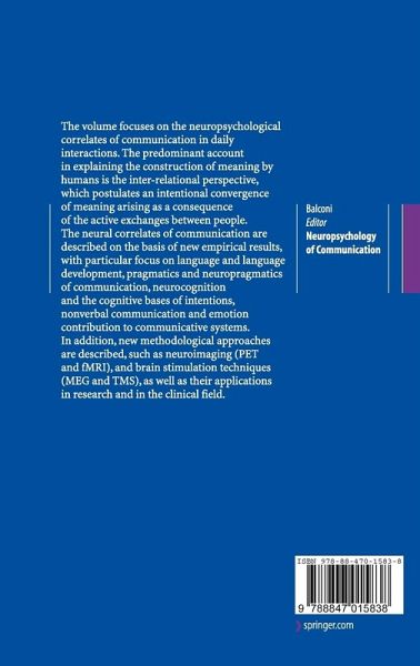 In this volume, the communicative and neuropsychological correlates of daily interactions are discussed. The predominant account on explaining the construction of meaning by humans is the inter-relational perspective, that postulates an intentional convergence of meaning arising as a consequence of the active exchanges between people. The neural correlates of communication were illustrated in the light of new empirical results, considering the main topics of: a) language and language development; b) pragmatics and neuropragmatics of communication; c) neurocognition and the cognitive bases of intentions; d) nonverbal communication and emotion contribution to the communicative systems.