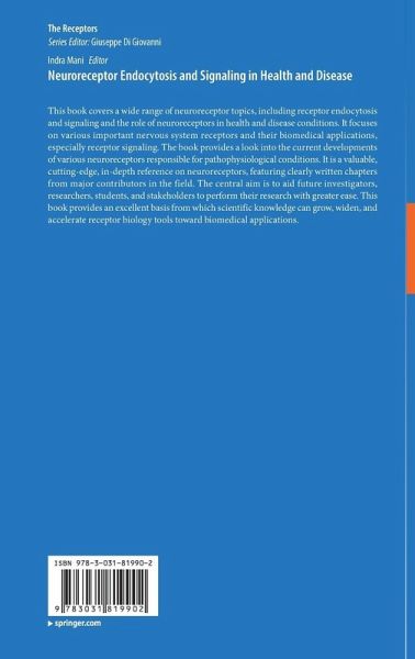 Insights of neuroreceptor endocytosis and signaling in health and disease.- Signaling Molecules: Importance in Health & Disease Conditions.- Emerging concept of receptor endocytosis and signalling.- Cutting-Edge Techniques Unveiling Receptor Endocytosis and Signaling Dynamics.- beta1-Adrenergic receptor endocytosis and signalling.- beta2-Adrenergic receptor endocytosis and signalling.- Muscarinic receptor-mediated adrenaline secretion in adrenal medullary chromaffin cells and roles of adrenaline for health and disease.- Activation mechanisms, trafficking, and signalling of GABAA receptors.- Kainate receptors trafficking, signalling and functional roles.- Glycine receptor endocytosis and signalling.- Histamine receptors endocytosis and signalling.- Opioid receptor endocytosis and signalling.- P2Y Receptor Endocytosis and Signalling.- Transferrin receptor endocytosis and signalling in health and disease.- Neurokinin 1 Receptor Endocytosis and Signaling.- Axon guidance receptor endocytosis, trafficking and signaling in health and disease.- Vesicular trafficking in neuronal development.- The cellular prion protein as universal receptor for amyloid proteins.- Drug Delivery to the Brain Using Endocytic Receptors as Carriers.- Application of Bioinformatics in Receptor Biology and Drug Discovery.
