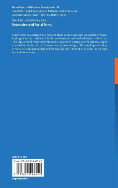 Part I Preclinical Research: Neuroendocrine Mechanisms of Social Bonds and Separation Stress in Rodents, Dogs, and Other Species.- Methods and Challenges in Investigating Sex-Specific Consequences of Social Stressors in Adolescence in Rats: Is It the Stress or the Social or the Stage of Development?- Social stress-induced neuroinflammation and mitochondrial dysfunction as a link to depression and cardiovascular disease comorbidity.- Mean Girls: Social Stress Models for Female Rodents.- Development of Mixed Anxiety/ Depression-Like State as a Consequence of Chronic Anxiety: Review of Experimental Data.- Unravelling the Neuroinflammatory Mechanisms Underlying the Effects of Social Defeat Stress on Use of Drugs of Abuse.- Social Stress and Aggression in Murine Models.- More or less: glucocorticoid roles in aggression.- Neurobiological Bases of Urges for Alcohol Consumption After Social Stress.- Epigenetics of Aggression.- Part II Human Research: Early Life Stress and Neurodevelopment in Adolescence: Implications for Risk and Adaptation.- Effects of Parenting Environment on Child and Adolescent Social-Emotional Brain Function.- The Stressed Brain: Neural Underpinnings of Social Stress Processing in Humans.- Social Acts and Anticipation of Social Feedback.- Clinical Outcomes of Severe Forms of Early Social Stress.- Childhood Violence Exposure, Inflammation, and Cardiometabolic Health.- Social Support Effects on Neural Stress and Alcohol Reward Responses.- Neural Underpinnings of Social Stress in Human Addiction.