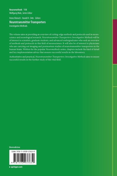 The volume aims at providing an overview of cutting-edge methods and protocols used in neuroscience and neurological research. Neurotransmitter Transporters: Investigative Methods will be of interest to scientists, graduate students, and advanced undergraduates who seek an overview of methods and protocols in this field of neuroscience. It will also be of interest to physicians who are carrying out imaging and postmortem studies of neurotransmitter transporters in the human brain. Written for the popular Neuromethods series, chapters include the kind of detail and key implementation advice that ensures successful results in the laboratory.