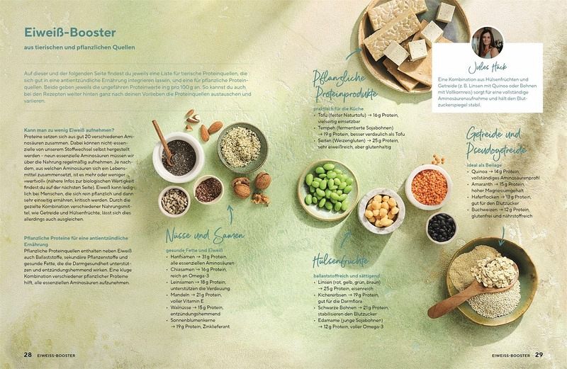 - Für jede Tageszeit das passende Gericht: vom ballaststoffreichen Kürbis-Porridge bis zum antientzündlichen Bulgur-Gemüse-Salat mit Granatapfel