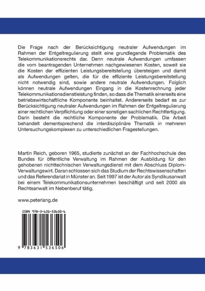 Die Frage nach der Berücksichtigung neutraler Aufwendungen im Rahmen der Entgeltregulierung stellt eine grundlegende Problematik des Telekommunikationsrechts dar. Denn neutrale Aufwendungen umfassen die vom beantragenden Unternehmen nachgewiesenen Kosten, soweit sie die Kosten der effizienten Leistungsbereitstellung übersteigen und damit als Aufwendungen gelten, die für die effiziente Leistungsbereitstellung nicht notwendig sind, sowie andere neutrale Aufwendungen. Folglich können neutrale Aufwendungen Eingang in die Kostenrechnung jeder Telekommunikationsdienstleistung finden, so dass die Thematik einerseits eine betriebswirtschaftliche Komponente beinhaltet. Andererseits bedarf es zur Berücksichtigung neutraler Aufwendungen im Rahmen der Entgeltregulierung einer rechtlichen Verpflichtung oder einer sonstigen sachlichen Rechtfertigung. Darin besteht die rechtliche Komponente der Problematik. Die Arbeit behandelt dementsprechend die interdisziplinäre Thematik in mehreren Untersuchungskomplexen zu unterschiedlichen Fragestellungen.