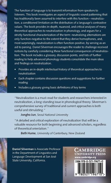 The function of language is to transmit information from speakers to listeners. This book investigates an aspect of linguistic sound patterning that has traditionally been assumed to interfere with this function - neutralization, a conditioned limitation on the distribution of a language's contrastive values. The book provides in-depth, nuanced and critical analyses of many theoretical approaches to neutralization in phonology and argues for a strictly functional characterization of the term: neutralizing alternations are only function-negative to the extent that they derive homophones, and most surprisingly, neutralization is often function-positive, by serving as an aid to parsing. Daniel Silverman encourages the reader to challenge received notions by carefully considering these functional consequences of neutralization. The book includes a glossary, discussion points and lists of further reading to help advanced phonology students consolidate the main ideas and findings on neutralization.