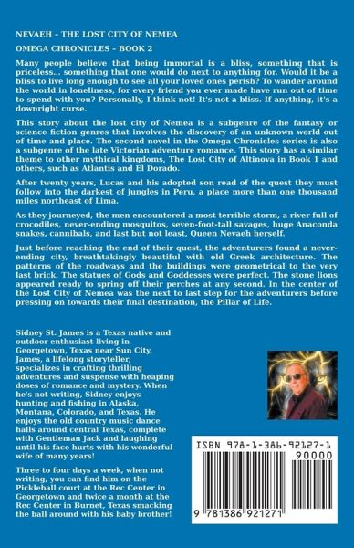 NEVAEH - THE LOST CITY OF NEMEA OMEGA CHRONICLES - BOOK 2 "If you were to destroy the belief in immortality in mankind, not only love but every living force on which the continuation of all life in the world depends, would dry up at once." - Fyodor Dostoevsky Many people believe that being immortal is a bliss, something that is priceless... something that one would do next to anything for. Would it be a bliss to live long enough to see all your loved ones perish? To wander around the world in loneliness, for every friend you ever made have run out of time to spend with you? Personally, I think not! It's not a bliss. If anything, it's a downright curse. This story about the lost city of Nemea is a subgenre of the fantasy or science fiction genres that involves the discovery of an unknown world out of time and place. The second novel in the Omega Chronicles series is also a subgenre of the late Victorian adventure romance. This story has a similar theme to other mythical kingdoms, The Lost City of Altinova in Book 1 and others, such as Atlantis and El Dorado. Lucas Petersen, a professor at the University of Texas, is resting quietly in his apartment on Guadalupe Street near the main campus. There's a knock at his door that surprised him. He is visited by Tommy Hansen, a good friend. With him, he brought a steel box, sat it down at his friend's table, and explained his unusual request, including the fact that he was soon to die. Part of the request was that the contents of the box couldn't be disclosed for twenty years. Later that day, Lucas received a message that his good friend did in fact die the same night, after visiting with him. At that time, he adopted his friend's five-year old son and waited over twenty years to open the steel box. After twenty years, Lucas and his adopted son read of the quest they must follow into the darkest of jungles in Peru, a place more than one thousand miles northeast of Lima. As they journeyed, the men encountered a most terrible storm, a river full of crocodiles, never-ending mosquitos, seven-foot-tall savages, huge Anaconda snakes, cannibals, and last but not least, Queen Nevaeh herself. Just before reaching the end of their quest, the adventurers found a never-ending city, breathtakingly beautiful with old Greek architecture. The patterns of the roadways and the buildings were geometrical to the very last brick. The statues of Gods and Goddesses were perfect. The stone lions appeared ready to spring off their perches at any second. In the center of the Lost City of Nemea was the next to last step for the adventurers before pressing on towards their final destination, the Pillar of Life.