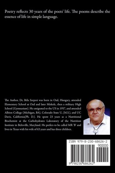 The Author, Dr, Béla Szepesi was born in Ozd, Hungary, attended Elementary School at Ozd and later Miskolc, then a military High School (Gymnasium). He emigrated to the US in 1957, and attended Albion College (Michigan, BA), Colorado State U, (M.S.), and UC Davis, California(Ph. D.). He spent 23 years as a Nutritional Biochemist at the Carbohydrates Laboratory of the Nutrition Institute in Beltsville, Maryland. He prefers to be called MR 'B' and lives in Texas with his wife of 63 years and has three children.