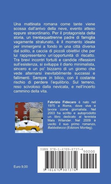 Una mattinata romana come tante viene scossa dall'arrivo della neve, evento atteso eppure straordinario. Per il protagonista della storia, un trentaquattrenne padre di famiglia vagamente stralunato, è il momento ideale per immergersi a fondo in una città diversa dal solito, a caccia di piccoli obiettivi che per lui rappresentano un'opportunità di riscatto. Tra brevi incontri fortuiti e candide riflessioni sull'esistenza, si sviluppa il diario minimalista, sincero e un po' bizzarro di un giorno che vede alternarsi inevitabilmente successi e fallimenti. Sempre in bilico, con il costante rischio di perdere l'equilibrio. Sul terreno, reso scivoloso dalla nevicata, e nell'incerto cammino della vita.