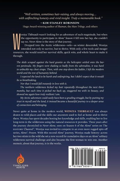 Woniya Thibeault wasn't looking for an adventure of such magnitude, but when the opportunity to participate in Alone® Season 6 fell into her lap, she couldn't say no. Never Alone is the story of that journey. Dropped into the Arctic wilderness-solo-as winter descended, Woniya intended not only to survive, but to thrive. With only a few tools and meager resources, she would need her survival skills, quick wits, and whole heart to make it through. The skids scraped against the hard granite as the helicopter settled onto the barren peninsula. My fingers were shaking so badly from the adrenaline, it was hard to unbuckle my chest straps. Then, with one step down the ladder, I left the modern world and the rest of humanity behind. I expected the land to be harsh and unforgiving, but I didn't expect that it would be so breathtaking. Nor that I would fall instantly in love with it. The northern wilderness kicked my butt repeatedly throughout the next three months, but each time it picked me back up, staggered me with its beauty, and showed me again how truly resilient I am. My Arctic adventure could easily have been a grueling struggle, but by putting my trust in myself and the land, it instead became a beautiful journey to a deeper sense of connection and belonging. In her debut memoir Never Alone: A Solo Arctic Survival Journey, Woniya shares how months of starving by herself in the Arctic wilderness brought more healing than suffering, and led to a deep sense of belonging and peace. Her story affirms the incredible strength of the human spirit and shows us that strength comes in many surprising forms. Never Alone's message is one of inspiration and learning to trust in ourselves and the land around us; embracing the wild and being wholly and beautifully human, flaws and all. Never Alone will take you on an Arctic journey through challenges and triumphs, joys and heartbreaks, and leave you inspired and wanting more.