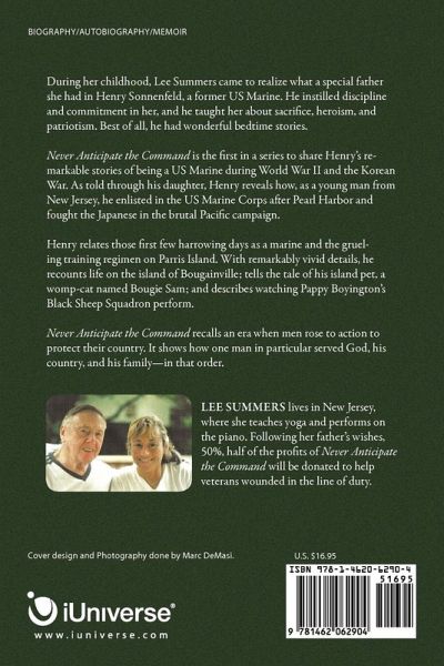 During her childhood, Lee Summers came to realize what a special father she had in Henry Sonnenfeld, a former US Marine. He instilled discipline and commitment in her, and he taught her about sacrifice, heroism, and patriotism. Best of all, he had wonderful bedtime stories. Never Anticipate the Command is the first in a series to share Henry's remarkable stories of being a US Marine during World War II and the Korean War. As told through his daughter, Henry reveals how, as a young man from New Jersey, he enlisted in the US Marine Corps after Pearl Harbor and fought the Japanese in the brutal Pacific campaign. Henry relates those first few harrowing days as a marine and the grueling training regimen on Parris Island. With remarkably vivid details, he recounts life on the island of Bougainville; tells the tale of his island pet, a womp-cat named Bougie Sam; and describes watching Pappy Boyington's Black Sheep Squadron perform. Never Anticipate the Command recalls an era when men rose to action to protect their country. It shows how one man in particular served God, his country, and his family-in that order.