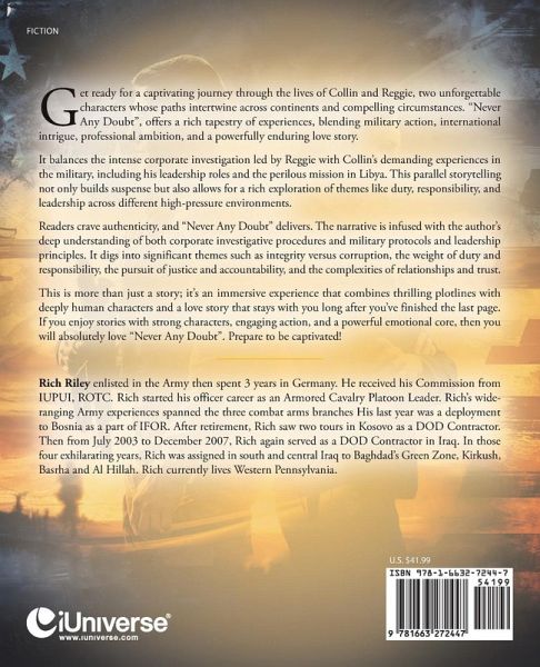 Get ready for a captivating journey through the lives of Collin and Reggie, two unforgettable characters whose paths intertwine across continents and compelling circumstances. "Never Any Doubt", offers a rich tapestry of experiences, blending military action, international intrigue, professional ambition, and a powerfully enduring love story. It balances the intense corporate investigation led by Reggie with Collin's demanding experiences in the military, including his leadership roles and the perilous mission in Libya. This parallel storytelling not only builds suspense but also allows for a rich exploration of themes like duty, responsibility, and leadership across different high-pressure environments. Readers crave authenticity, and "Never Any Doubt" delivers. The narrative is infused with the author's deep understanding of both corporate investigative procedures and military protocols and leadership principles. It digs into significant themes such as integrity versus corruption, the weight of duty and responsibility, the pursuit of justice and accountability, and the complexities of relationships and trust. This is more than just a story; it's an immersive experience that combines thrilling plotlines with deeply human characters and a love story that stays with you long after you've finished the last page. If you enjoy stories with strong characters, engaging action, and a powerful emotional core, then you will absolutely love "Never Any Doubt". Prepare to be captivated!