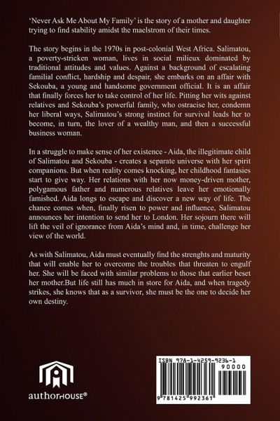 'Never Ask Me About My Family' is the story of a mother and daughter trying to find stability amidst the maelstrom of their times. The story begins in the 1970s in post-colonial West Africa. Salimatou, a poverty-stricken woman, lives in social milieux dominated by traditional attitudes and values. Against a background of escalating familial conflict, hardship and despair, she embarks on an affair with Sekouba, a young and handsome government official. It is an affair that finally forces her to take control of her life. Pitting her wits against relatives and Sekouba's powerful family, who ostracise her, condemn her liberal ways, Salimatou's strong instinct for survival leads her to become, in turn, the lover of a wealthy man, and then a successful business woman. In a struggle to make sense of her existence - Aida, the illegitimate child of Salimatou and Sekouba - creates a separate universe with her spirit companions. But when reality comes knocking, her childhood fantasies start to give way. Her relations with her now money-driven mother, polygamous father and numerous relatives leave her emotionally famished. Aida longs to escape and discover a new way of life. The chance comes when, finally risen to power and influence, Salimatou announces her intention to send her to London. Her sojourn there will lift the veil of ignorance from Aida's mind and, in time, challenge her view of the world. As with Salimatou, Aida must eventually find the strenghts and maturity that will enable her to overcome the troubles that threaten to engulf her. She will be faced with similar problems to those that earlier beset her mother.But life still has much in store for Aida, and when tragedy strikes, she knows that as a survivor, she must be the one to decide her own destiny.