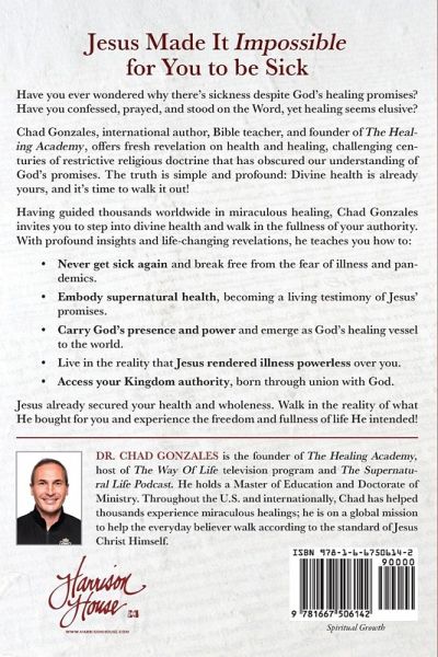 Jesus Made It Impossible for You to be SickHave you ever wondered why there's sickness despite God's healing promises? Have you confessed, prayed, and stood on the Word, yet healing seems elusive?Chad Gonzales, international author, Bible teacher, and founder of The Healing Academy, offers fresh revelation on health and healing, challenging centuries of restrictive religious doctrine that has obscured our understanding of God's promises. The truth is simple and profound: Divine health is already yours, and it's time to walk it out!Having guided thousands worldwide in miraculous healing, Chad Gonzales invites you to step into divine health and walk in the fullness of your authority. With profound insights and life-changing revelations, he teaches you how to:Never get sick again and break free from the fear of illness and pandemics. Embody supernatural health, becoming a living testimony of Jesus' promises. Carry God's presence and power and emerge as God's healing vessel to the world. Live in the reality that Jesus rendered illness powerless over you. Access your Kingdom authority, born through union with God. Jesus already secured your health and wholeness. Walk in the reality of what He bought for you and experience the freedom and fullness of life He intended!
