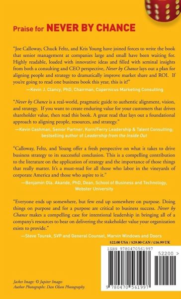 Praise for Never By Chance "Joe Calloway, Chuck Feltz, and Kris Young have joined forces to write the book that senior management at companies large and small have been waiting for. Highly readable, loaded with innovative ideas and filled with seminal insights from both a consulting and CEO perspective, Never by Chance lays out a plan for aligning people and strategy to dramatically improve market share and ROI. If you're going to read one business book this year, this is it!" --Kevin J. Clancy, PhD, Chairman, Copernicus Marketing Consulting "Never by Chance is a real-world, pragmatic guide to authentic alignment, vision, and strategy. If you want to create enduring value for your customers that drives shareholder value, then read this book. A great read that lays out a foundational approach to aligning people, resources, and strategy." --Kevin Cashman, Senior Partner, Korn/Ferry Leadership & Talent Consulting; bestselling author of Leadership from the Inside Out "Calloway, Feltz, and Young offer a fresh perspective on what it takes to drive business strategy to its successful conclusion. This is a compelling contribution to the literature on the application of strategy and the importance of those things that really matter. It's a must-read for all those who labor in the vineyards of corporate America and those who aspire to it." --Benjamin Ola. Akande, PhD, Dean, School of Business and Technology, Webster University "Everyone ends up somewhere, but few end up somewhere on purpose. Doing things on purpose and for a purpose are critical to business success. Never by Chance makes a compelling case for intentional leadership in bringing all of a company's resources to bear on delivering the stakeholder value your organization exists to provide." --Steve Tourek, SVP and General Counsel, Marvin Windows and Doors