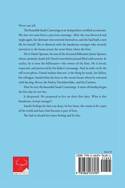 Never can tell. The beautiful Sarah Cummings is an independent certified accountant. She has two sons from a previous marriage. After she was divorced and single again, her dormant wits renewed themselves, and she had built a new life for herself. She is obsessed with the handsome stranger who recently moved in to the house across the street from where she lives. He is Daniel Spenser, the son of the deceased billionaire James Spenser, whose untimely death left Daniel overwhelmed and filled with sorrow. In reality, he is now the billionaire--the owner of the firm. He is loved, respected, and protected by his father's entourage. And in order to fit the self to its sphere, Daniel realizes that rest is the thing he needs. Joe Sellers, his colleague, handed him the keys to the vacant house where he retreated with his dog, Rover, his Harley Davidson bike, and his Camino. Here he met the beautiful Sarah Cummings. A sense of kinship began the first day he saw her. It deepened. He proposed to her on their first date. Who is this handsome, kempt stranger? Sarah's feelings for him run deep. In her heart, she wants to be a part of his world and have him become a part of hers. She had to sheath her inner feeling and let fate