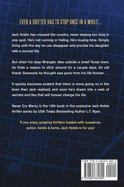 Even a drifter has to stop once in a while... Jack Noble has crossed the country, never staying too long in one spot. He's not running or hiding. He's buying time. Simply living until the day he can disappear and provide his daughter with a normal life. But when his Jeep dies outside a small Texas town, he finds a reason to stick around for a couple days. An old friend. Someone he thought was gone from his life forever. It quickly becomes evident that there is more going on in the town than Jack realized, and soon he's drawn into a web of secrets and lies that will forever change his life. ¿Never Cry Mercy is the 10th book in the explosive Jack Noble thriller series by USA Today Bestselling Author L.T. Ryan. Fans of Tom Clancy, Lee Child's Jack Reacher, Vince Flynn's Mitch Rapp, and Robert Ludlum's Jason Bourne will enjoy this suspense-filled Jack Noble thriller.