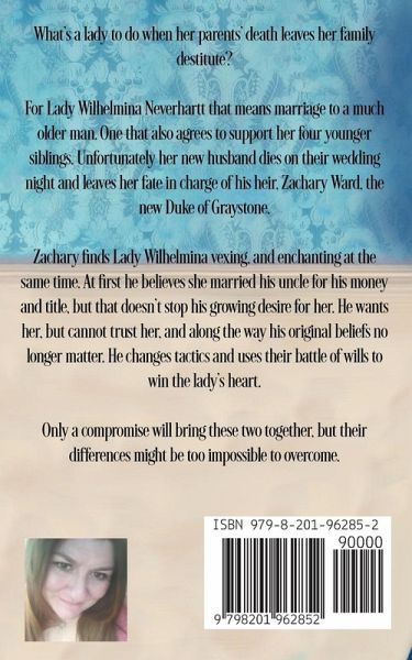 What's a lady to do when her parents' death leaves her family destitute? For Lady Wilhelmina Neverhartt that means marriage to a much older man. One that also agrees to support her four younger siblings. Unfortunately her new husband dies on their wedding night and leaves her fate in charge of his heir, Zachary Ward, the new Duke of Graystone. Zachary finds Lady Wilhelmina vexing, and enchanting at the same time. At first he believes she married his uncle for his money and title, but that doesn't stop his growing desire for her. He wants her, but cannot trust her, and along the way his original beliefs no longer matter. He changes tactics and uses their battle of wills to win the lady's heart. Only a compromise will bring these two together, but their differences might be too impossible to overcome.