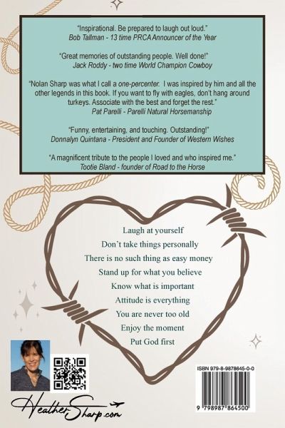 "Inspirational. Be prepared to laugh out loud." - Bob Tallman A tribute to the author's remarkable family and the legends of the rodeo world who illustrate life lessons such as:Put God first You can do anything Be honest Laugh at yourself Stand up for what you believe Attitude is everything You are never too old There is no such thing as easy money Stand by your man Enjoy the moment Know what's important You don't have to be a horse person to enjoy this book. The life lessons in this book apply to us all. Be inspired as you read or listen to stories about:John Roddy, who immigrated from Ireland with $18 and became a millionaire World Champion Cowboy John W. Jones, when he cut off barrel racer Marian Sharp's ponytail and handed it to her RSC- the Rodeo Stock Contracting Company The American Rodeo Show in Japan Oscar the Bull Jawbreaker the Bucking Horse Pat Parelli, Tootie Bland, and Chris Cox Veterinarian Dr. Nolan Sharp who was one of the first to use acupuncture on horses Hysterical stories about Marian Sharp, including the Pyramid scheme and the arrest that followed, and everyone's favorite, the inversion boot story. The common refrain she heard was, "You just can't make this up" The following people contributed to these remarkable stories and in the audiobook you will hear the actual voices of:Bob Tallman Pat Parelli Jack Roddy Jack Sparrowk Jimmy Roddy Steve Cosca Gene St. John Jr. Carla Harrison Ted Ryan Brian Sharp Grant Schlichting Ryan Schlichting The pictures are in black and white in the paperback, but use the QR code on heathersharp.com to see Marian in her gold shiny-hineys and Nolan in his queen outfit with a red hat and blond wig and the 90 other priceless photos that you have to see to believe. Life Nolan and Marian Sharp was never dull!