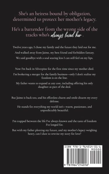 She's an heiress bound by obligation, determined to protect her mother's legacy. He's a bartender from the wrong side of the tracks who's always loved her. Twelve years ago, I chose my family and the future they laid out for me. And walked away from Jaime, my best friend and forbidden fantasy. We said goodbye with a soul searing kiss I can still feel on my lips. Now I'm back in Silverpine for the first time since my mother died. I'm brokering a merger for the family business-only I don't realize my freedom is on the line. My father wants to expand at any cost, including offering his only daughter as part of the deal. But Jaime is back too, and his effortless charm and smile disarm my every defense. He stands for everything my world isn't-warm, passionate, and unpredictably beautiful. I'm trapped between the life I've always known and the taste of freedom I've longed for. But with my father plotting my future, and my mother's legacy weighing heavy, can I dare to rewrite my story for love?