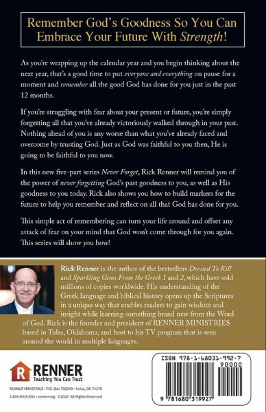 Remember God's Goodness So You Can Embrace Your Future With Strength! As you're wrapping up the calendar year and you begin thinking about the next year, that's a good time to put everyone and everything on pause for a moment and remember all the good God has done for you just in the past 12 months. If you're struggling with fear about your present or future, you're simply forgetting all that you've already victoriously walked through in your past. Nothing ahead of you is any worse than what you've already faced and overcome by trusting God. Just as God was faithful to you then, He is going to be faithful to you now. In this new five-part series Never Forget, Rick Renner will remind you of the power of never forgetting God's past goodness to you, as well as His goodness to you today. Rick also shows you how to build markers for the future to help you remember and reflect on all that God has done for you. This simple act of remembering can turn your life around and offset any attack of fear on your mind that God won't come through for you again. This series will show you how!