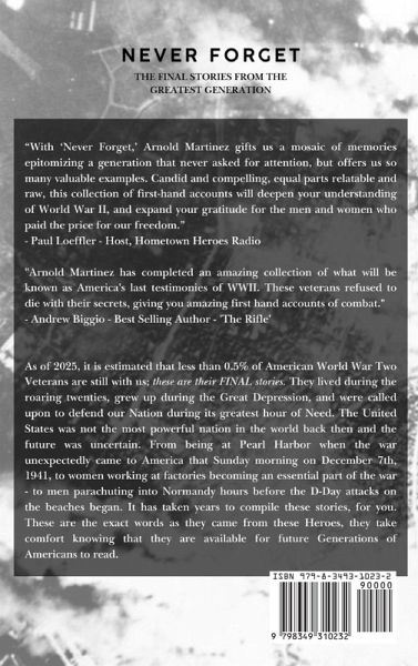"With 'Never Forget,' Arnold Martinez gifts us a mosaic of memories epitomizing a generation that never asked for attention, but offers us so many valuable examples. Candid and compelling, equal parts relatable and raw, this collection of first-hand accounts will deepen your understanding of World War II, and expand your gratitude for the men and women who paid the price for our freedom." - Paul Loeffler - Host, Hometown Heroes Radio "Arnold Martinez has completed an amazing collection of what will be known as America's last testimonies of WWII. These veterans refused to die with their secrets, giving you amazing first hand accounts of combat." - Andrew Biggio - Best Selling Author - 'The Rifle' As of 2025, it is estimated that less than 0.5% of American World War Two Veterans are still with us; these are their FINAL stories. They lived during the roaring twenties, grew up during the Great Depression, and were called upon to defend our Nation during its greatest hour of Need. The United States was not the most powerful nation in the world back then and the future was uncertain. From being at Pearl Harbor when the war unexpectedly came to America that Sunday morning on December 7th, 1941, to women working at factories becoming an essential part of the war - to men parachuting into Normandy hours before the D-Day attacks on the beaches began. It has taken years to compile these stories, for you. These are the exact words as they came from these Heroes, they take comfort knowing that they are available for future Generations of Americans to read.