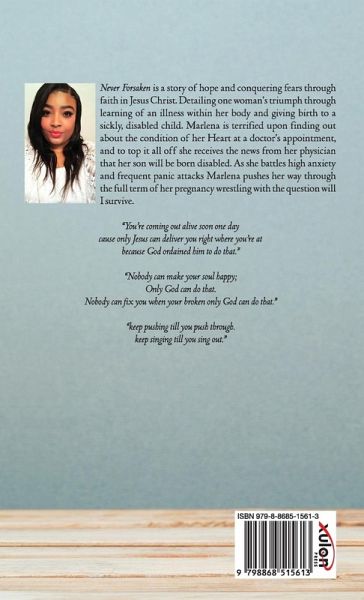 Never Forsaken is a story of hope and conquering fears through faith in Jesus Christ. Detailing one woman's triumph through learning of an illness within her body and giving birth to a sickly, disabled child. Marlena is terrified upon finding out about the condition of her Heart at a doctor's appointment, and to top it all off she receives the news from her physician that her son will be born disabled. As she battles high anxiety and frequent panic attacks Marlena pushes her way through the full term of her pregnancy wrestling with the question will I survive. "You're coming out alive soon one day cause only Jesus can deliver you right where you're at because God ordained him to do that." "Nobody can make your soul happy; Only God can do that. Nobody can fix you when your broken only God can do that." "keep pushing till you push through. keep singing till you sing out."