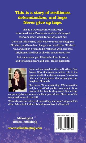 This is a story of resilience, determination, and hope. Never give up hope. This is a true account of a little girl who saved Katie Fasciano's world and changed everyone else's world for all who met her. Come on this journey with Katie to meet her daughter, Elizabeth, and have her change your world too. Elizabeth was and still is a force to be reckoned with. Her love brightened the lives of all who encountered her. Let Katie show you Elizabeth's love, bravery, and tenacious heart and soul. This is Elizabeth.